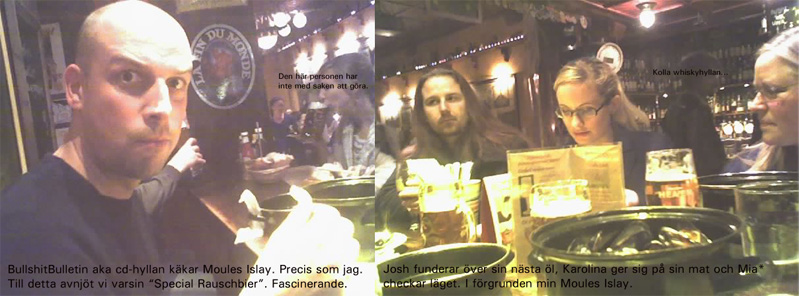 Vi käkade. Jag och BB tog in ”moules Islay” dvs. musslor kokta med bacon och Islaywhisky. Och som tur var tog vi de små portionerna – för tillsammans med Akkurats fantastiska hemgjort pommes var det mer än nog. Till det drack vi ett rökt tyskt öl. Fantastisk smak och jäkligt gott tillsammans med musslorna.