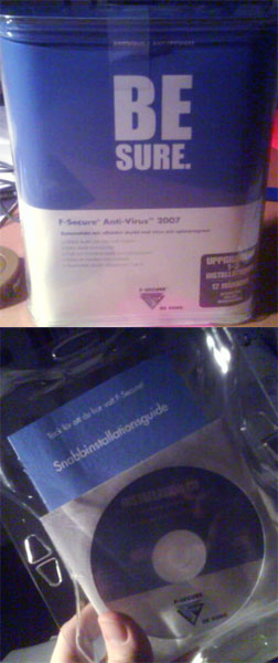 Jag tillhör inte miljömupparnas skara. Och jag gillar snygga förpackningar. Men årets version av F-Secures anti-virusprogram får till och med mig att reagera över ett flagrant resursslöseri. Vi snacka om en låda som är något mindre än ett A4. Det må vara ok – för att synas i hyllan antagligen. Problemet är att inuti finns ytterligare en stor plasthållare för den enda cd-skiva och booklet som skickas med!