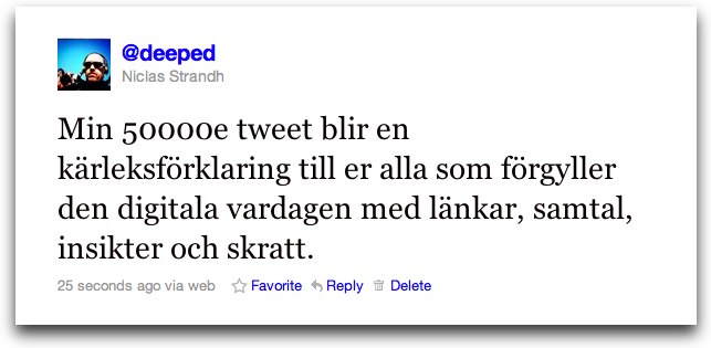 Idag skickade jag min 50 000 tweet (faktiskt är @ame_tyst värre än mig med 58k). Det är lite absurt på många sätt men så är det. När jag skaffade Twitter i april 2007 var jag den fem miljonte någonting medlemmen. Idag är det 125 miljoner som använder nätverket.