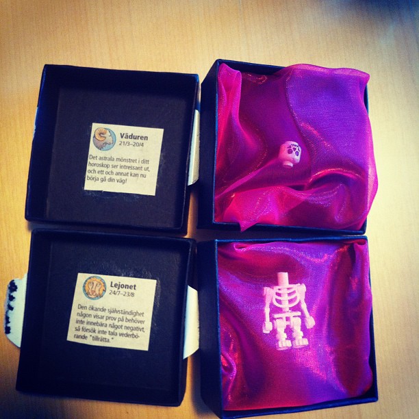 När vi sedan öppnade dem (jag fick öppna först, jag är äldst och därmed närmast döden) så låg en dekapiterad legoskelettgubbe där. Kroppen i en och huvudet i den andra. Och våra stjärntecken: